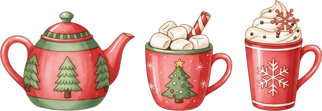 A red teapot adorned with evergreen trees and snowflakes accompanied by two festive mugs filled with hot beverages and whipped cream Christmas Hot Chocolate