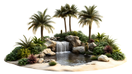 Lush oasis paradise: serene waterfall flowing into a pond with palms and plants