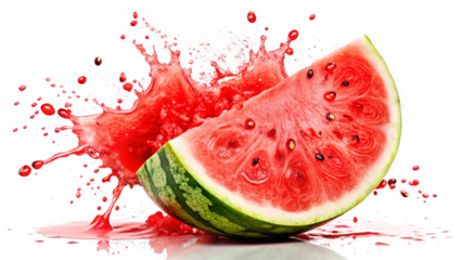 A vibrant watermelon slice explodes in a burst of red juice, creating a dynamic splash against a clean white backdrop