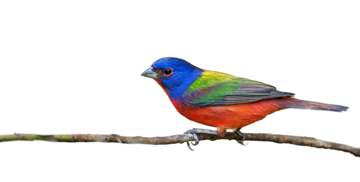 A painted bunting (Passerina ciris) male perching on a twig. Clipped from my real photo shot in Corkscrew Regional Ecosystem Watershed, Florida. transparent PNG with real bird isolated.