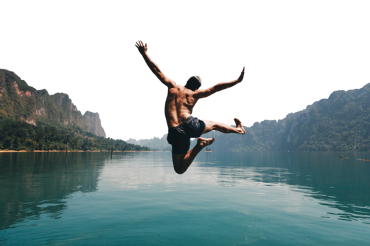 PNG Man jumping with joy by a lake, collage element, transparent background