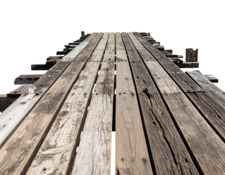 A weathered wooden pier extends forward against a black background, showcasing natural textures and rustic, aged planks.