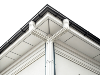 White plastic rain gutter system attached to the roof corner of a modern house showing the downspout pipe for water drainage concepts in home maintenance and construction services