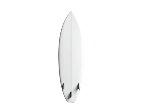 Isolated, white, three-finned surfboard stands vertically on a solid black background