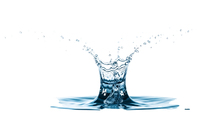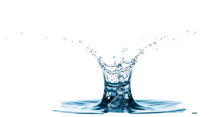 Refreshing water splashing creating a crown shape over a glass of clear liquid, symbolizing hydration and purity, transparent background