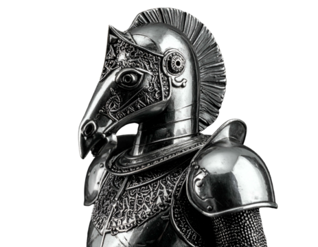 Highly detailed metallic horse-faced knight's armor with feathered crest