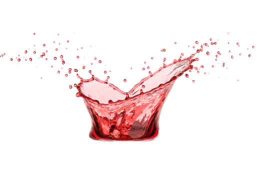 Vibrant translucent red liquid splash with rising droplets and elegant wave form in a high-speed burst, against a transparent studio background with reflection concept for beverage advertising