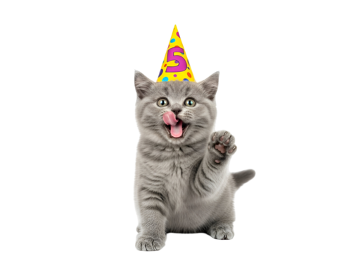 Adorable Grey British Shorthair Kitten Celebrating 5th Birthday, Wearing a Vibrant Party Hat, Sitting with Open Mouth and Raised Paw, Looking Playful and Happy, isolated on transparent background.