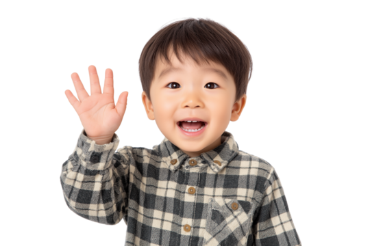 Smiling man wearing a formal suit waving hello . Isolated on transparent background, png