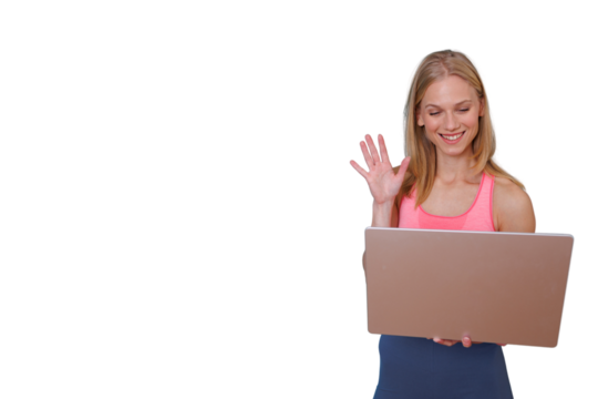 Woman waving hello during video call on laptop communicating online about fitness, exercise, and healthy lifestyle