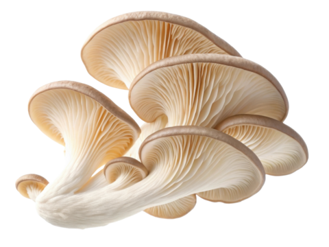 A group of oyster mushrooms with soft, wavy caps in a pale beige color, arranged elegantly on a white background.