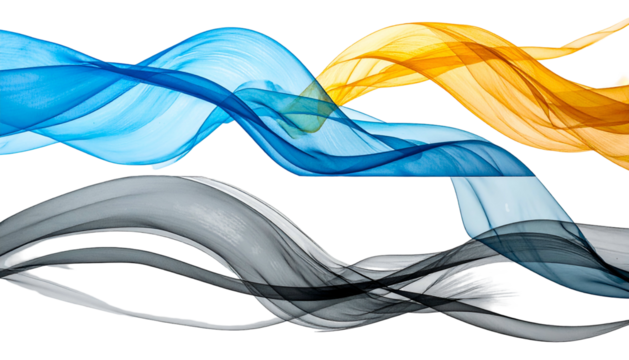 Wavy, translucent ribbons in blue, gold, and grey flow across a black background