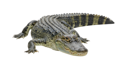 Alligator with scaly skin and striped tail on isolated black background