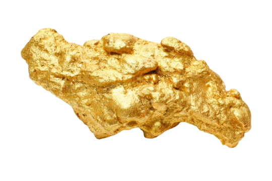 Rough golden metallic nugget with irregular surface texture, showing natural mineral formation and reflective metallic sheen, isolated on a transparent background