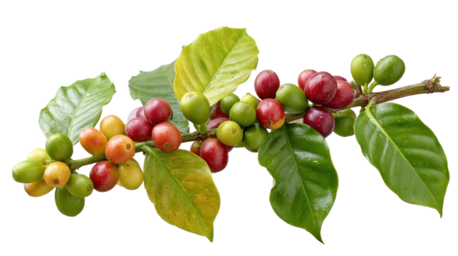 Coffee Cherry Branch: Close-up of a vibrant branch adorned with coffee cherries, showcasing the journey from green to ripe, and the rich colors and textures.