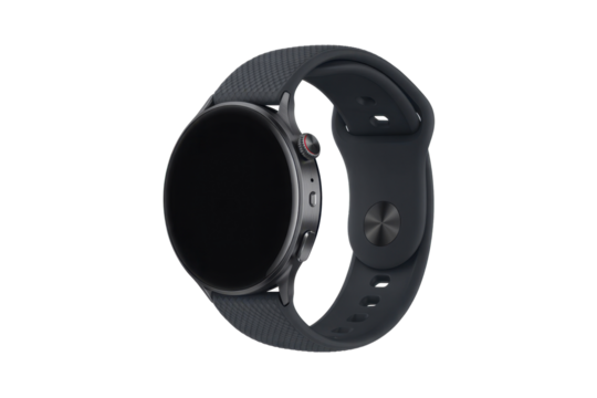 Silver smartwatch PNG isolated on transparent background, wearable tech device with dark blue band for fitness and modern lifestyle