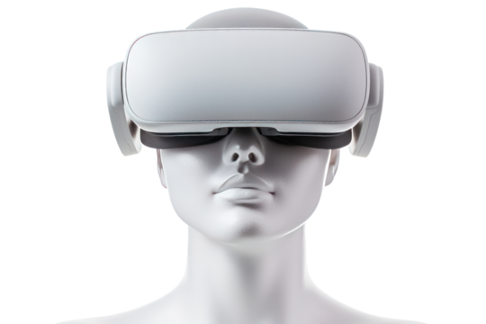 A photorealistic rendering of a virtual reality headset, its immersive capabilities captured in the wearer's enraptured expression, isolated on white