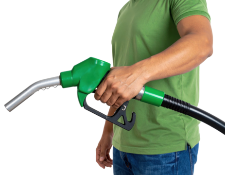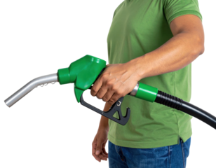 A person wearing a green shirt holds a green fuel pump nozzle connected to a black hose.