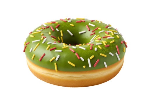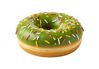 緑の釉薬輝くドーナツ、カラフルなスプリンクルが華やか