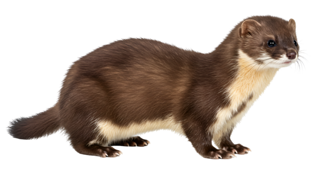 Isolated Least Weasel, ermine with brown fur and white chest, standing still and looking away