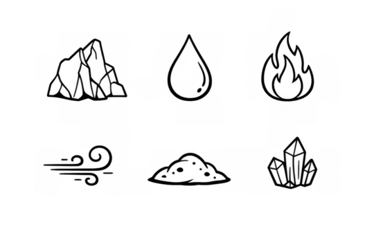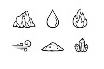 Hand drawn element icons for nature, water, fire, wind, earth, and crystal, using line art on transparent background