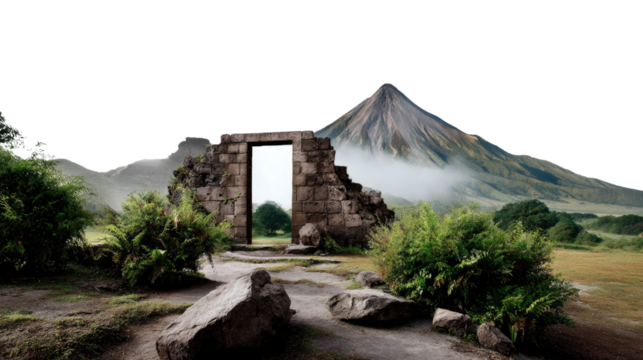 Gateway to the Summit: A weathered stone archway stands sentinel, framing a majestic mountain peak shrouded in mist, inviting exploration of a tranquil natural landscape.