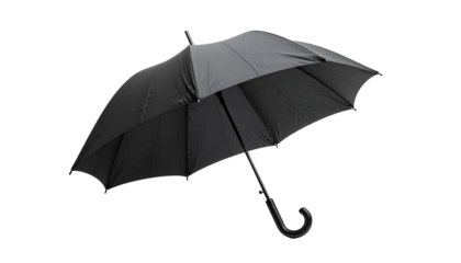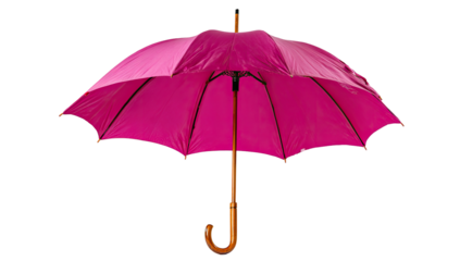 A vibrant magenta umbrella, open and angled slightly, against a black background.  The handle is a light brownish-tan color