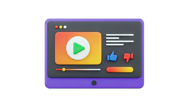 3D Render of a Stylized Computer Screen with Play Button and Like Icon