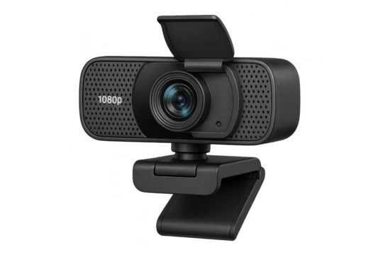 Modern 1080p webcam with open privacy cover isolated on transparent background
