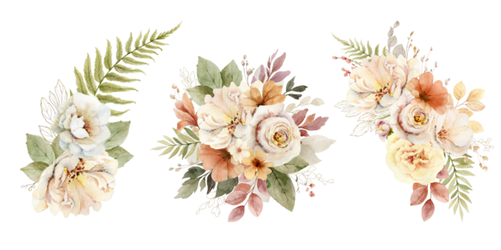 Watercolor set of flower bouquets with soft light blush roses and leaves.  Arrangement for greeting cards, stationery, wedding invitations and decorations. Hand painted  illustration.