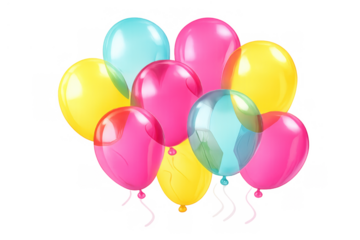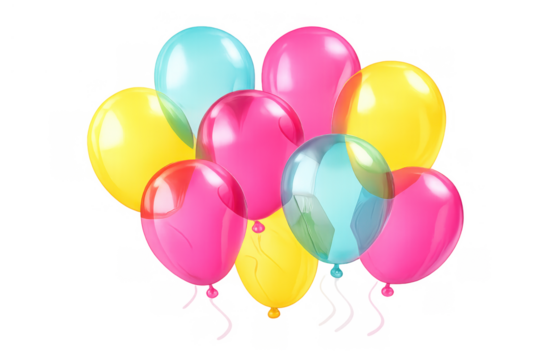 Bunch of shiny, vibrant balloons in pink, yellow, and blue colors, floating together for fun events, transparent background