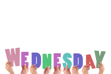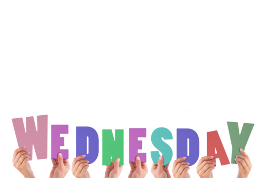 Transparent hands holding letters forming wednesday day name