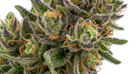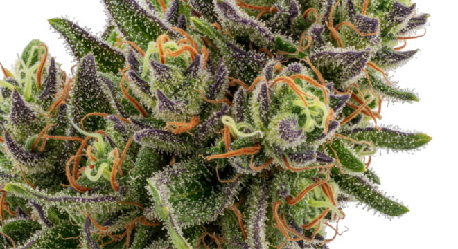 Trichomeladen cannabis bud frosty purple  green pistils ablaze