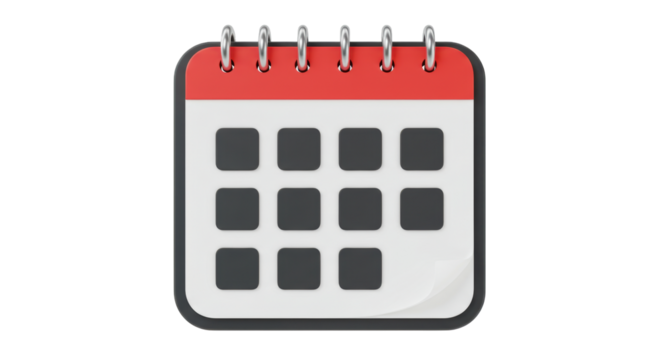 Isolated glossy red calendar icon for scheduling events and appointments, meeting reminder