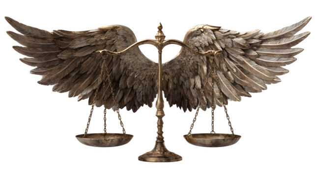 Wings attached to a balance scale, divine justice concept, isolated on white background