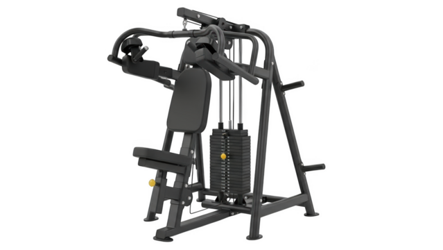 Black gym chest press machine with weight stack on black background gym equipment fitness machine