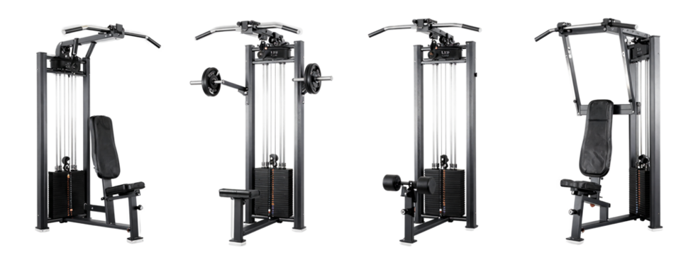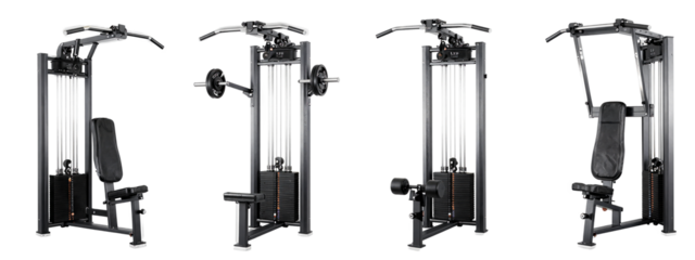 Photograph of four different views of a black weight machine with a padded seat, weight plates, and vertical pull cables.