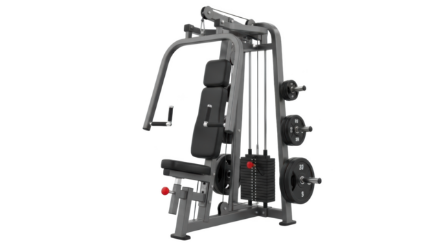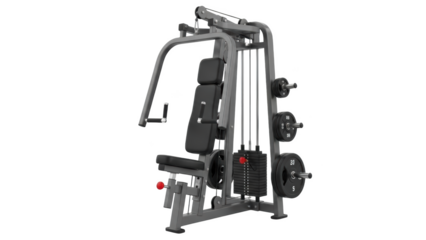 Silver and black multi gym machine with weight stack and padded seat and backrest gym equipment fitness machine
