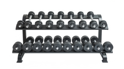 Dumbbell rack for organized weight storage on a minimalist white background showcasing various dumbbell sizes and arrangements