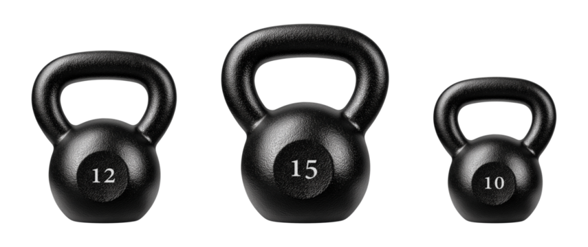 Three black kettlebells of different weights on transparent background