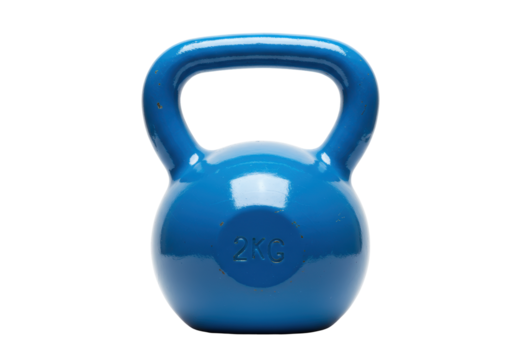 Isolated shiny blue 2kg kettlebell on a neutral backdrop for weightlifting and exercise workout