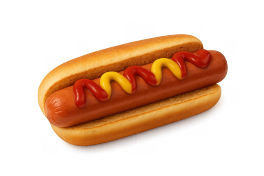 Hot dog with ketchup and mustard on a toasted bun, classic american fast food snack for events and bbqs
