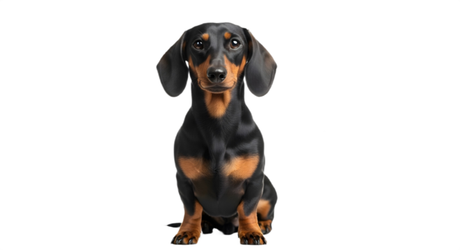 A dachshund dog sitting and looking at the camera on transparent background