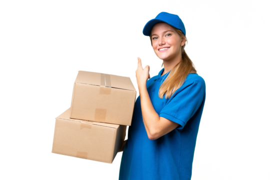 Young Asian woman taking a bag of takeaway food over isolated background pointing back