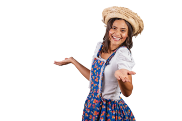 Brazilian woman wearing country clothes, São João party, Junina party. inviting hands.