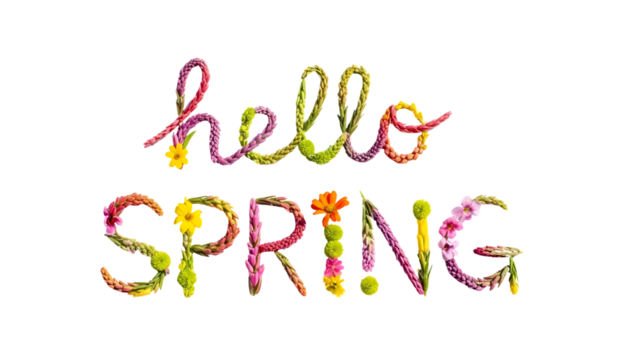 Hello Spring floral text, blooming flowers and green leaves forming words on white background