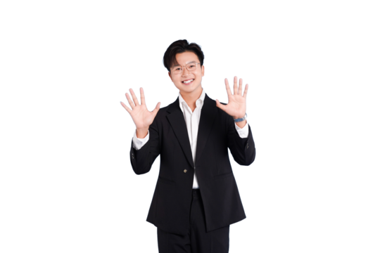 Optimistic Portrait: A confident individual, clad in a professional suit, beams a warm smile, raising both hands in a welcoming gesture, conveying positivity.