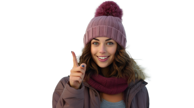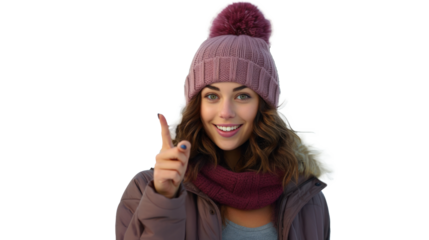 beautiful brunette, bundled up for winter, stands against a snowy forest, pointing upward with joy, welcoming winter and the holidays. It reflects outdoor activities, skiing, healthy winter lifestyle.