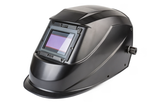 A sleek black welding helmet, isolated on transparent background offering protection and style for professional welders in industrial settings