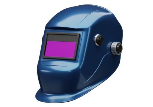 Isolated blue welding helmet for industrial workers with protective lens for safety gear